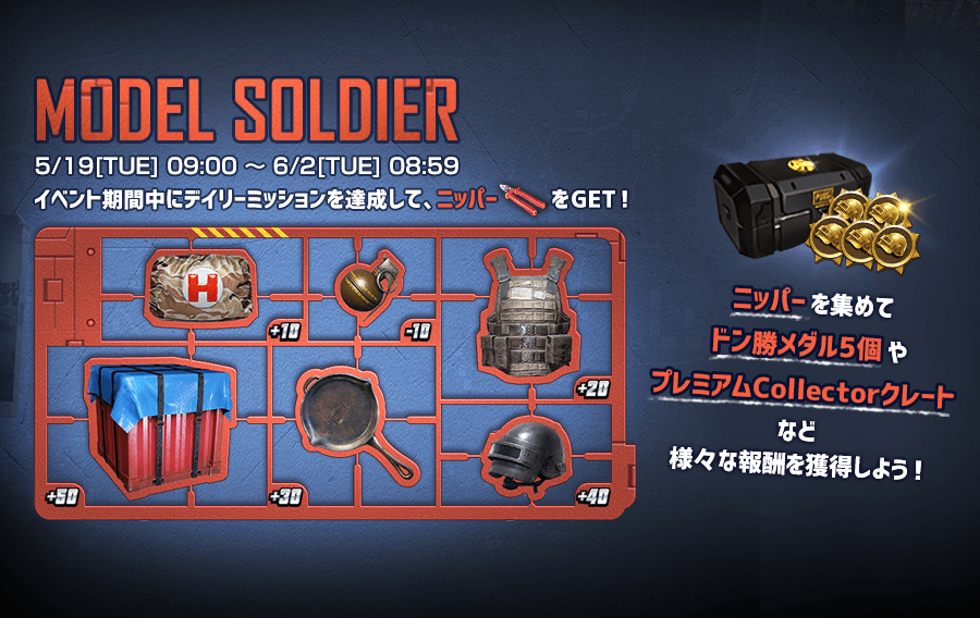 イベント期間中にデイリーミッションを達成すると「ニッパー」を獲得できます。 「ニッパー」を使用してランダムにポイントを獲得でき、「ドン勝メダル」5個や「プレミアムCollectorクレート」などの報酬と交換できます。 ■開催期間 [もっと見る]