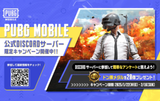 公式Discordサーバーで、キャンペーン期間中に指定のチャンネルからアンケートに回答しよう! 回答してくれた方に「ドン勝メダル×20個」をプレゼントします。 さらに、アンケートの回答者が100人増えるごとに、Collectorクレートチケットのかけら×1個(上限10個まで)をプレゼント! この機会に、公式Discordサーバーに参加して、報酬をGETしよう! [もっと見る]